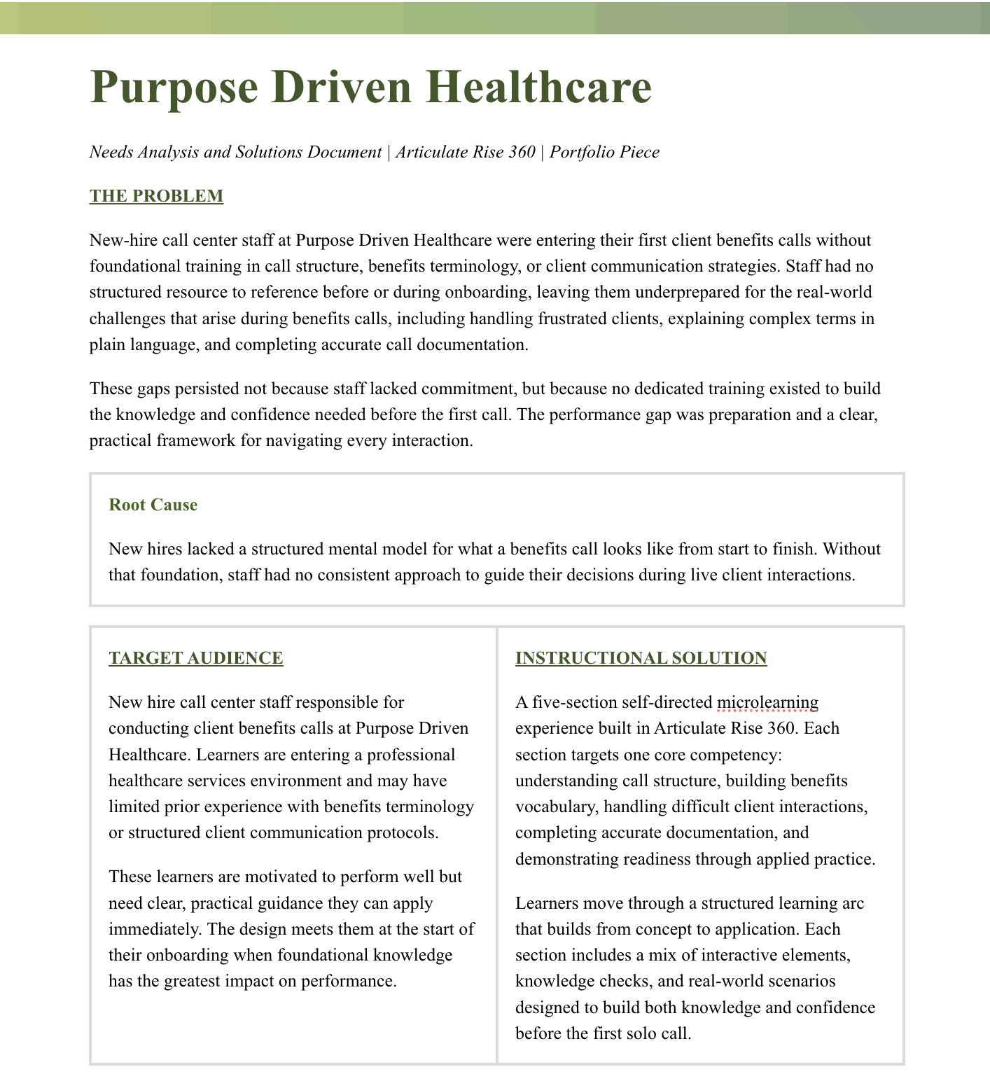 Purpose Driven Healthcare’s call center staff were being onboarded without a dedicated training resource for handling client benefits calls. New hires had no structured way to learn the phases of a call, the terminology they would encounter, or how to respond when a client became frustrated or confused.